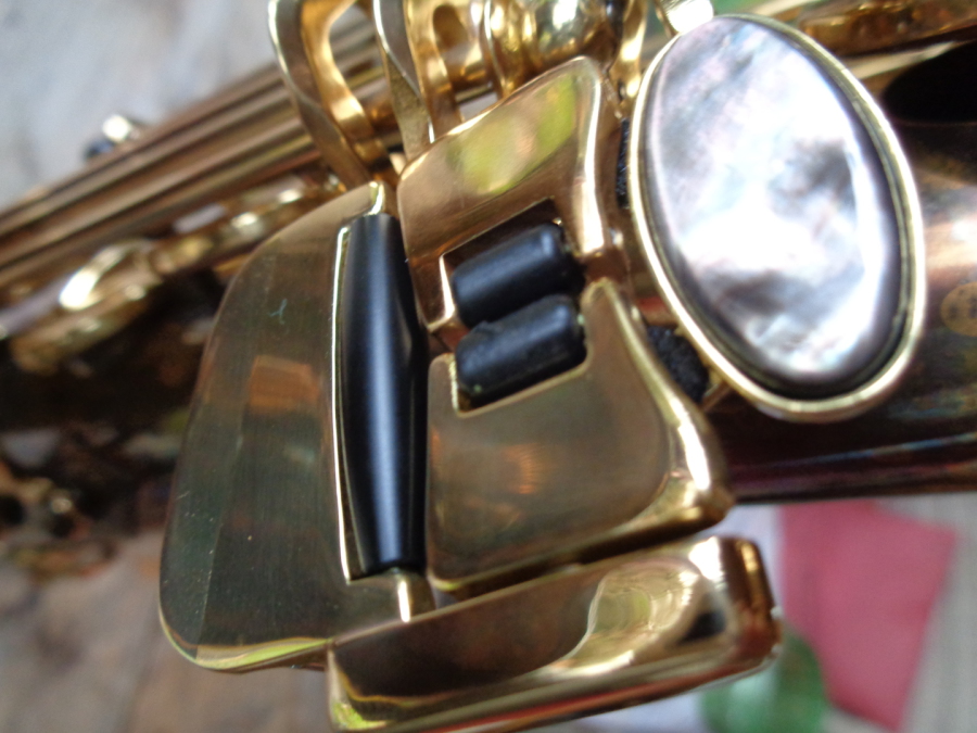 Das Sax verfügt über gebördelte Tonlöcher und einer Stimmschraube am S-Bogen, wie man den Bildern entnehmen kann ist das Saxophon in einem super Erhaltungszustand mit der Trichtergravur: