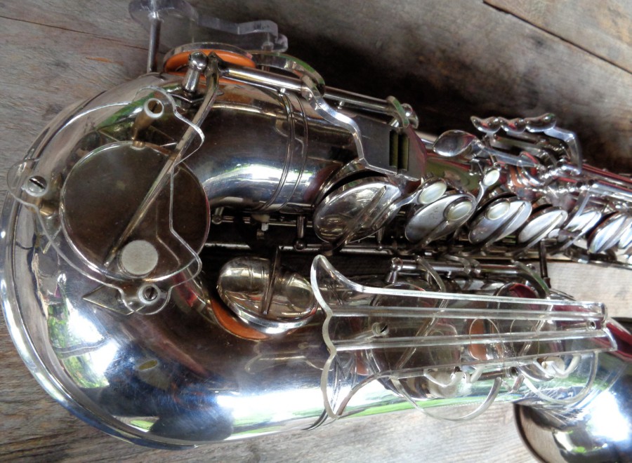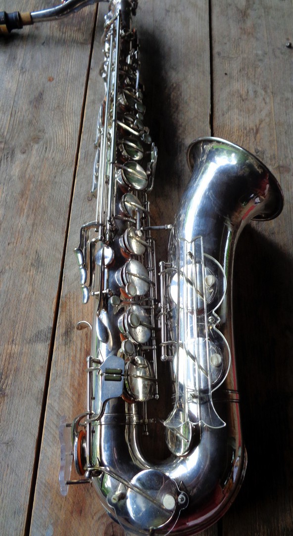 Dieses Saxophon ist aus den 40ziger Jahren und weist Gebrauchsspuren auf.Die Versilberung ist noch gut erhalten- ebenso die Vergoldung im Trichter.